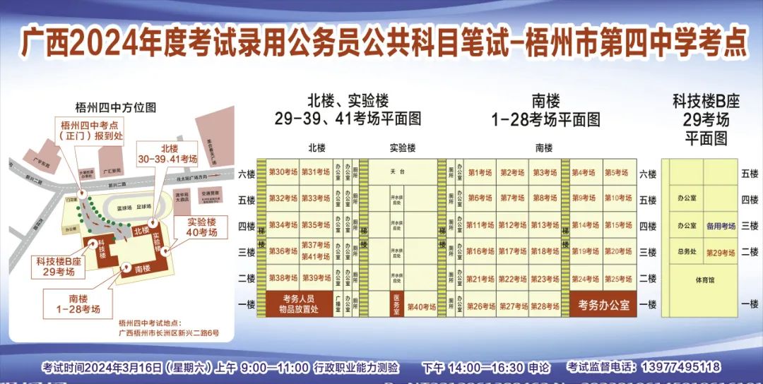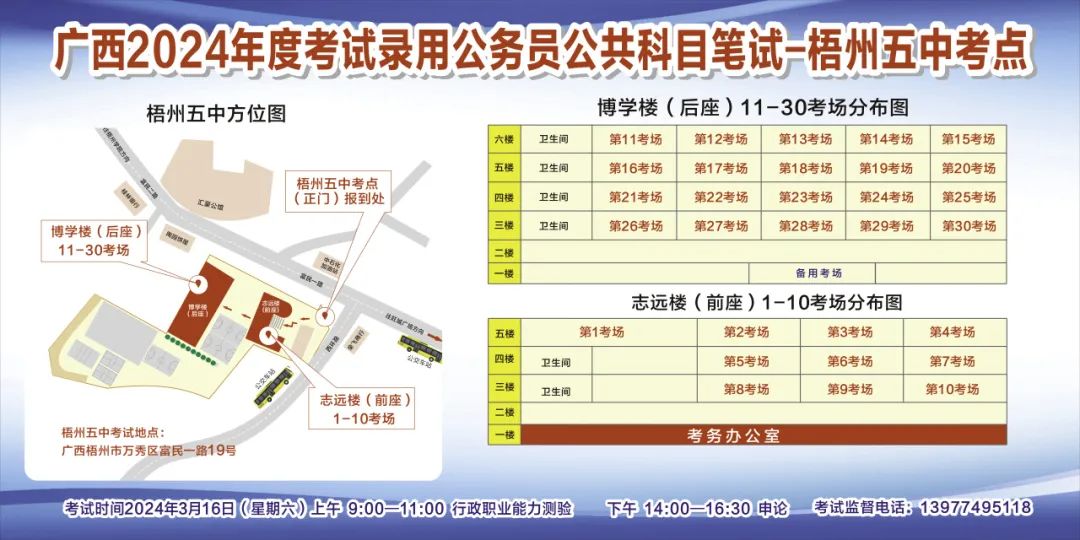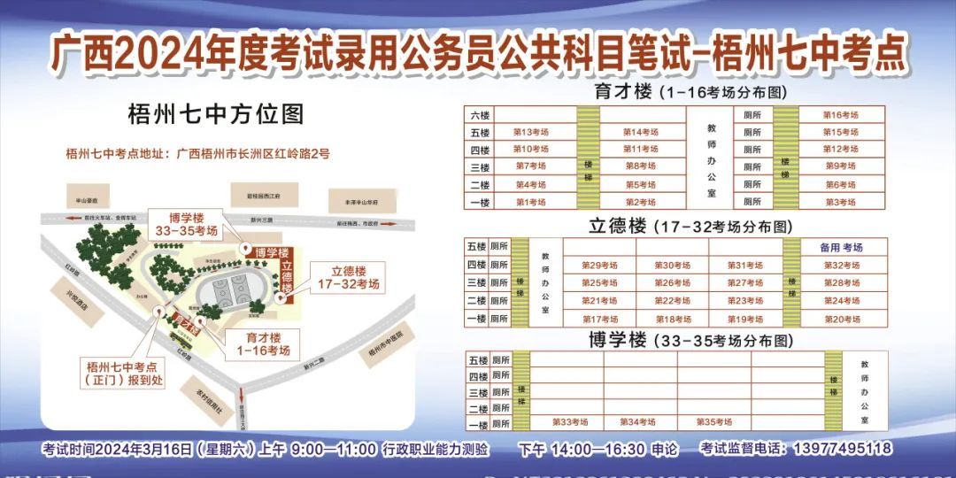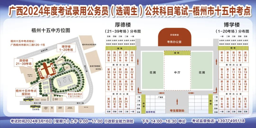 一、廣西2024年度考試錄用公務(wù)員(選調(diào)生)公共科目筆試將于3月16日舉行,梧州考區(qū)共設(shè)置9個考點,請考生提前熟悉各自考點位置、周邊環(huán)境及交通情況,考試當天提前出門做好準備,準時參加考試。特別提示:因考點停車場地有限,所有考生車輛不得進入考點,請考生規(guī)劃好前往考點的交通方式和路線。