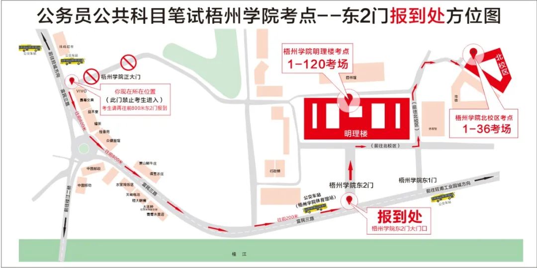 公交車參考:乘坐10路、32路、49路、49路延長線、蒼梧城鄉(xiāng)6路到梧州學(xué)院體育館站,下車后步行約200米到達梧州學(xué)院東大門??忌y(tǒng)一在梧州學(xué)院東大門進入,考點門口處于交通干道,送考車輛只能在東門外短暫停留,梧州學(xué)院南門及其他門無法核驗考生身份。從東大門進入明理教學(xué)樓考點考場步行約5分鐘,進入北校區(qū)教學(xué)樓考點考場步行約15分鐘,請規(guī)劃好進入考點時間。