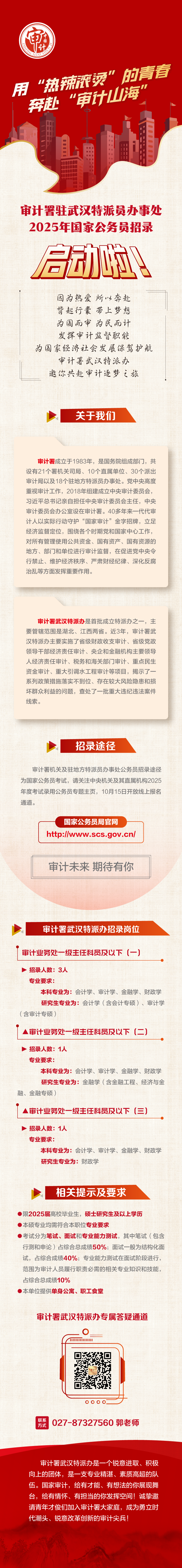 原文標(biāo)題:【現(xiàn)代服務(wù)】審計(jì)署駐武漢特派員辦事處2025年國家公務(wù)員招錄啟動(dòng)!