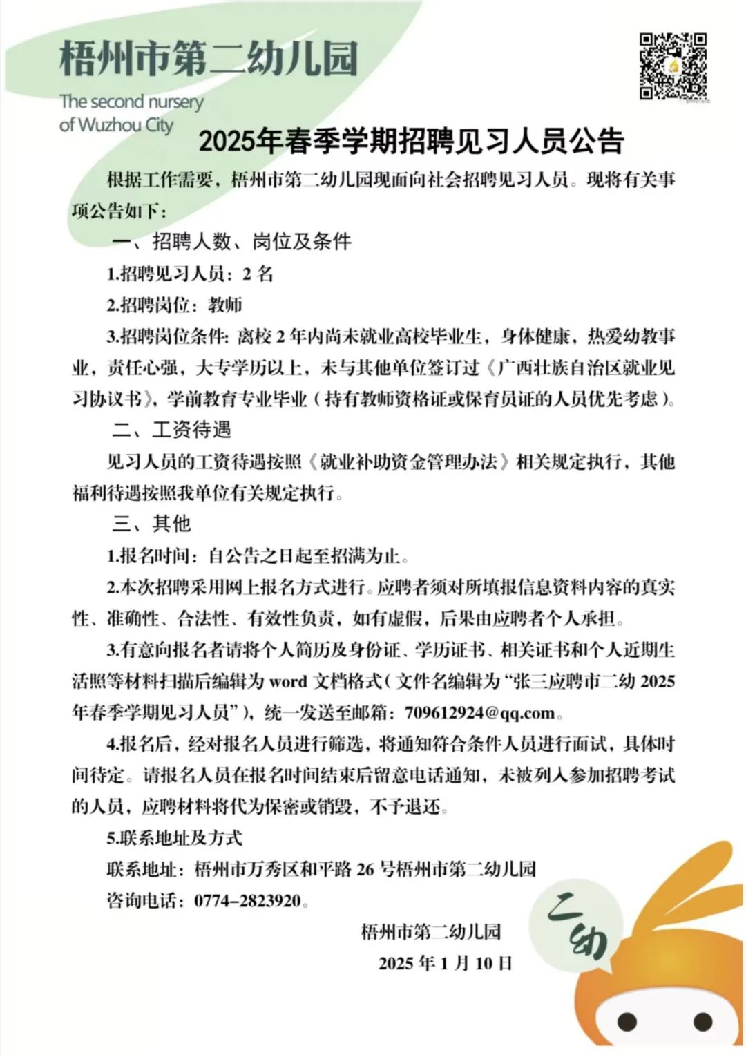 2025年梧州市第二幼兒園春季學期招聘見習人員公告