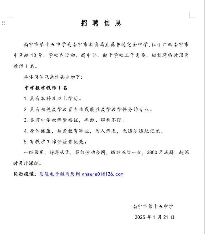 2025年南寧市第十五中學(xué)招聘中學(xué)數(shù)學(xué)老師1名