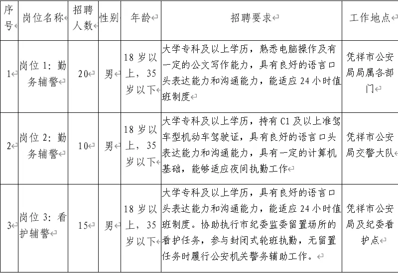 為適應憑祥市公安機關(guān)管理工作發(fā)展需要,憑祥市公安局決定面向社會公開招聘40名警務(wù)輔助人員(以下簡稱輔警)。具體事宜如下: