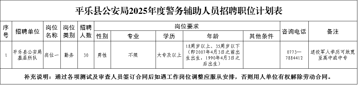 根據(jù)工作需要,平樂縣公安局2025年面向社會公開招聘30名警務(wù)輔助工作人員(簡稱輔警)?,F(xiàn)將有關(guān)事宜公告如下: