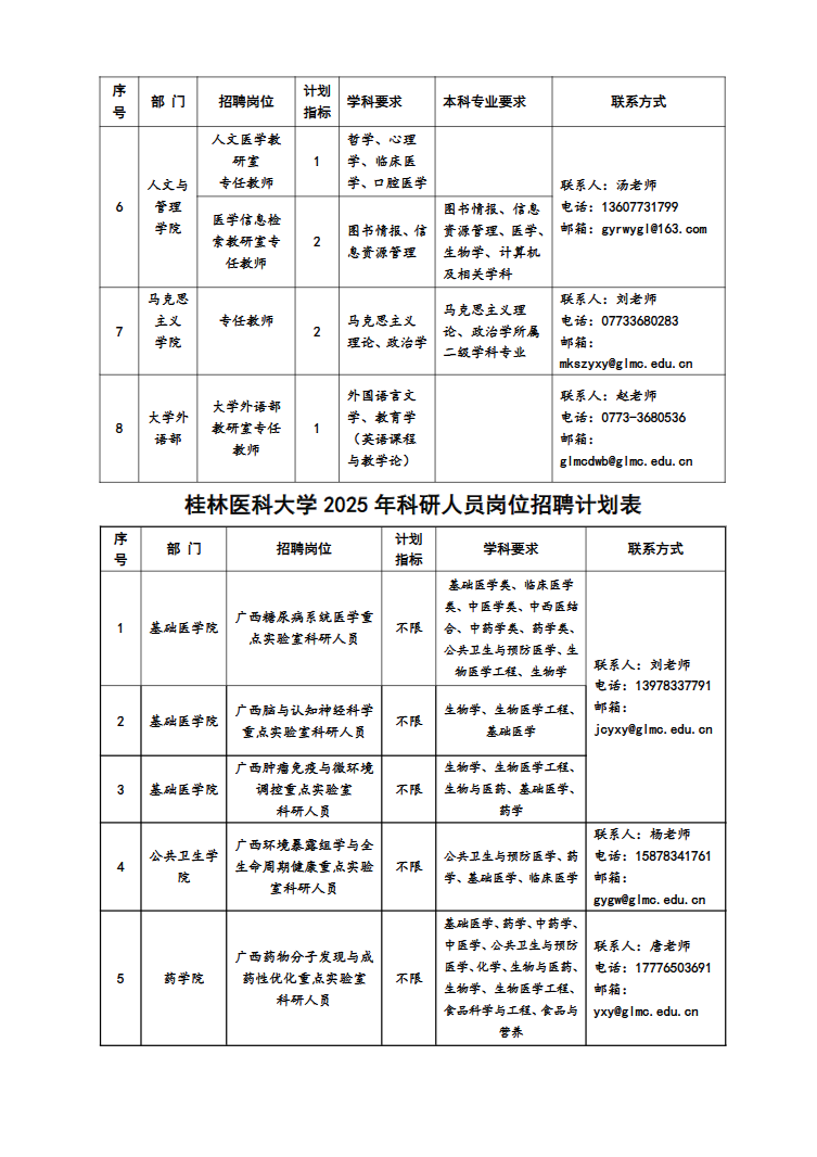 (二)各部門聯(lián)系方式見:桂林醫(yī)科大學(xué)各崗位招聘計劃表。