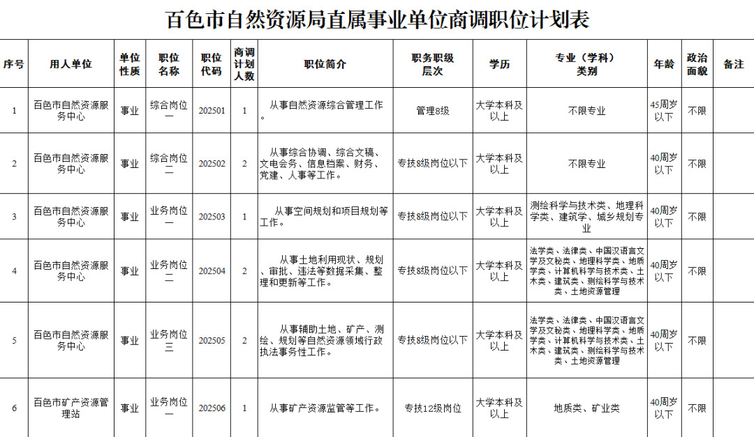 商調(diào)職位為百色市自然資源服務(wù)中心和百色市礦產(chǎn)資源管理站。具體職位信息詳見《百色市自然資源局直屬事業(yè)單位商調(diào)職位計劃表》。