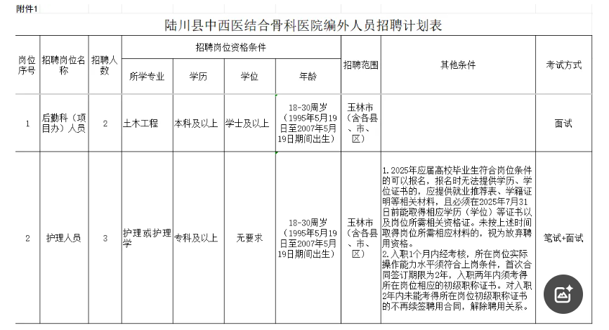 具體相關專業(yè)崗位條件詳見《陸川縣中西醫(yī)結合骨科醫(yī)院編外人員招聘計劃表》(附件1)。