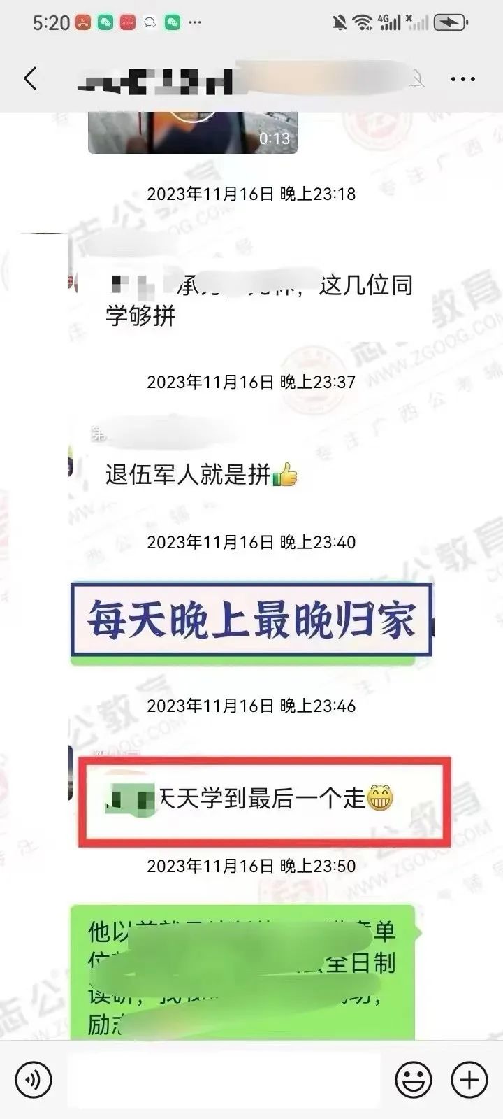 在備考的日子里,無數(shù)個(gè)夜晚,我看到他朋友圈發(fā)的經(jīng)常學(xué)習(xí)練習(xí)到教室關(guān)門最后一個(gè)才回家,無數(shù)次往返南寧和桂林兩座城市,只為家庭和研究生學(xué)業(yè)和公務(wù)員備考的有序進(jìn)行,讓我印象最深的一次,就是他微信拍了一張正在打針輸液的照片發(fā)給我,還打趣的跟我說:還好不影響我單手刷題! 即使學(xué)員因?yàn)樯眢w過于勞累導(dǎo)致生病在吊針,也絲毫沒有懈怠過學(xué)習(xí),讓我非常的佩服和感動(dòng)。