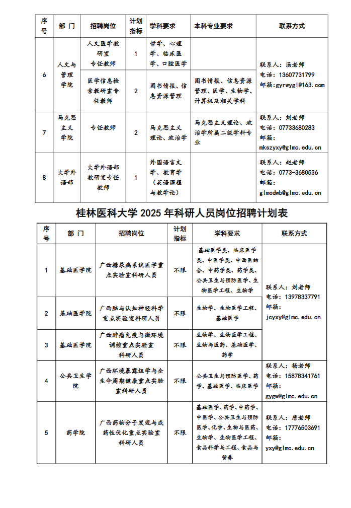 (二)各部門聯(lián)系方式見:桂林醫(yī)科大學各崗位招聘計劃表。