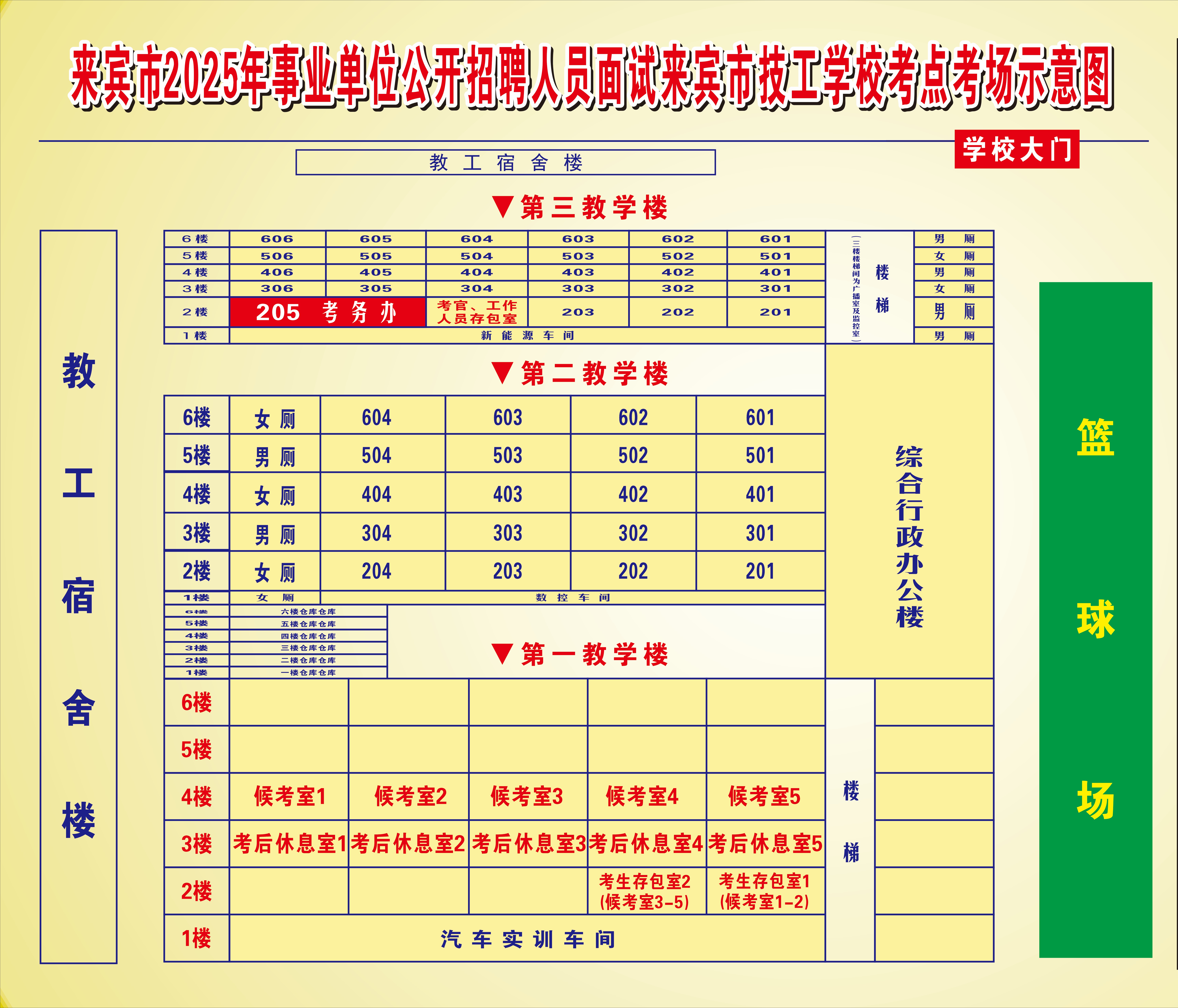 3.考生到達(dá)考點(diǎn)學(xué)校后,首先將除本人身份證、《面試通知書(shū)》外的禁止使用和攜帶的物品送到存包室存放,存包后到對(duì)應(yīng)候考室報(bào)到驗(yàn)證。候考室1、候考室2的考生到考生存包室1存包,候考室3、候考室4、候考室5的考生到考生存包室2存包。