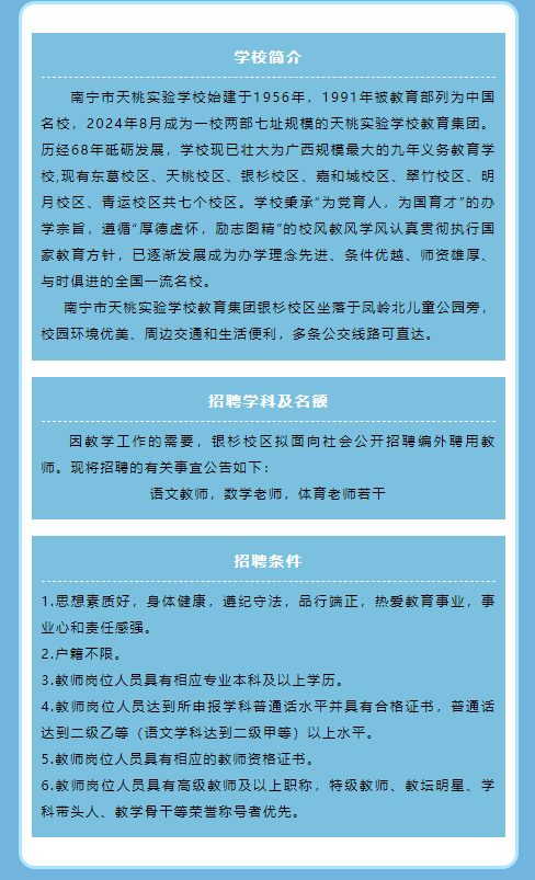 原文標(biāo)題:南寧市天桃實驗學(xué)校教育集團銀杉校區(qū)2025年外聘教職工招聘公告