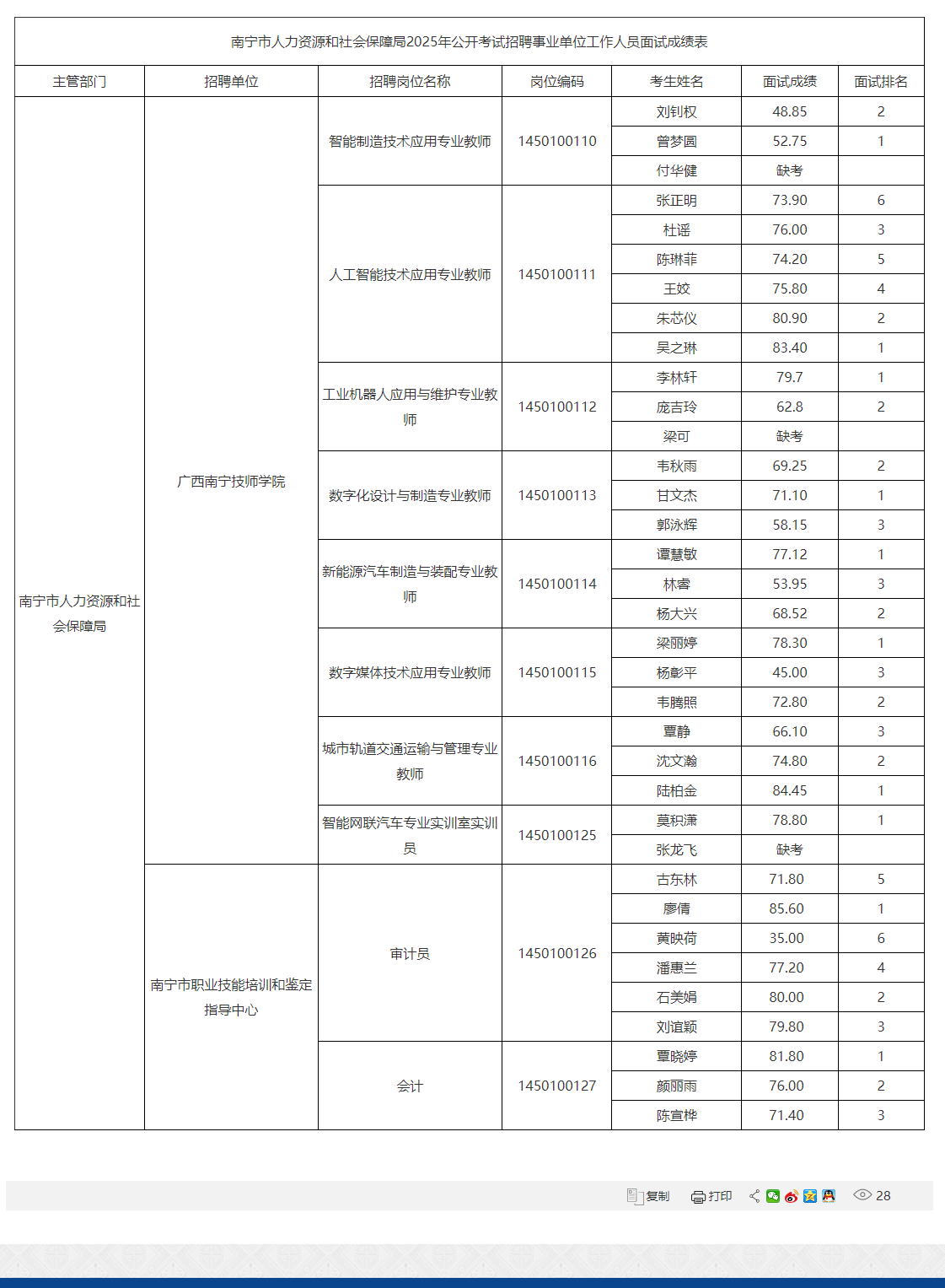 南寧市人力資源和社會(huì)保障局2025年公開(kāi)考試招聘事業(yè)單位工作人員面試成績(jī)表