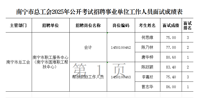 原文標(biāo)題:南寧市總工會(huì)2025年公開考試招聘事業(yè)單位工作人員面試成績表
