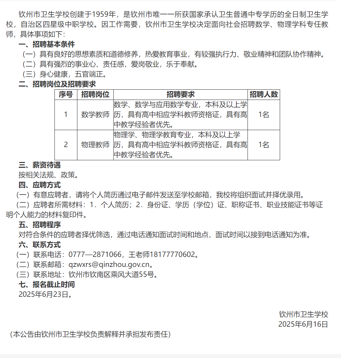 欽州市衛(wèi)生學(xué)校2025年公開(kāi)招聘數(shù)學(xué)、物理學(xué)科專(zhuān)任教師公告