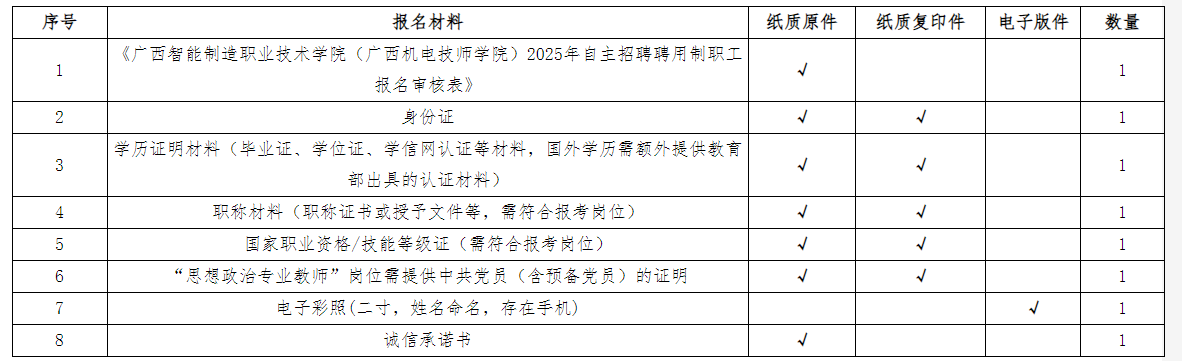 應(yīng)聘者按照招聘崗位具體要求對口報(bào)名,每名應(yīng)聘者限報(bào)一個崗位,采用現(xiàn)場報(bào)名遞交應(yīng)聘材料的方式報(bào)名。報(bào)名人員須下載并填寫《廣西智能制造職業(yè)技術(shù)學(xué)院(廣西機(jī)電技師學(xué)院)2025年自主招聘聘用制職工報(bào)名審核表》(附表2),同時需附上相應(yīng)的學(xué)歷、學(xué)位證書、身份證、職稱證書(相關(guān)崗位需要)等材料的原件與復(fù)印件(原件審核后退回,復(fù)印件不退回)