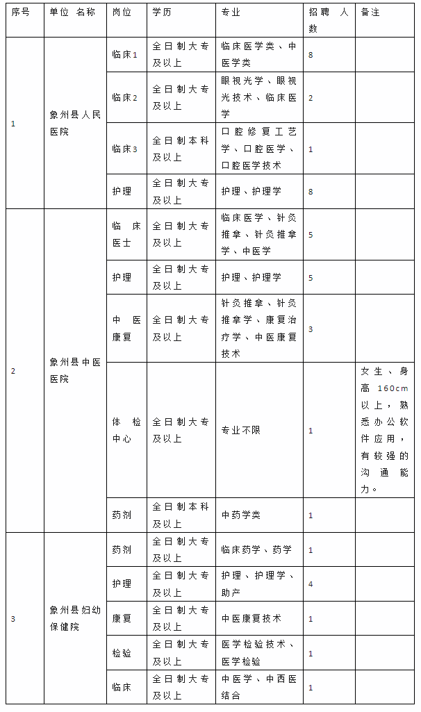 因工作需要,根據相關規(guī)定,我單位擬面向社會公開招聘見習人員42名,其中象州縣人民醫(yī)院19人、象州縣中醫(yī)醫(yī)院15人、象州縣婦幼保健院8人?,F將有關事項通知如下:
