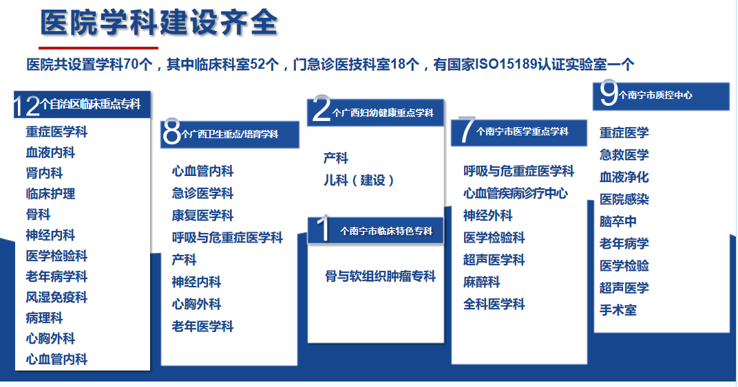 南寧市第一人民醫(yī)院(南寧市兒童先天性心血管疾病研究所、南寧市呼吸道疾病研究所、廣西醫(yī)科大學第五臨床醫(yī)學院、廣西醫(yī)科大學第五附屬醫(yī)院)始建于1914年,是一家擁有百年歷史的國家三級甲等綜合性醫(yī)院。醫(yī)院設(shè)有52個臨床病區(qū),18個門診醫(yī)技科室,總開放床位1912張(含分院)。醫(yī)院是國家高級認知中心建設(shè)單位及國家神經(jīng)介入建設(shè)中心、國家ISO15189醫(yī)學檢驗認證機構(gòu),國家聯(lián)盟中心認證的胸痛中心、卒中中心;擁有廣西臨床重點專科(含培育)12個、自治區(qū)醫(yī)療衛(wèi)生重點學科(含培育)8個、自治區(qū)婦幼健康服務(wù)重點學科(含建設(shè))2個、南寧市醫(yī)學重點學科7個、南寧市臨床特色優(yōu)勢???個,南寧市質(zhì)控中心9個。醫(yī)院是國家衛(wèi)健委創(chuàng)面修復能力建設(shè)和繼續(xù)教育中心教學基地、國家級住院醫(yī)師規(guī)范化培訓培訓基地,廣西醫(yī)科大學碩士研究生培養(yǎng)基地,同時是暨南大學共建醫(yī)學教育基地、第十批廣西博士后創(chuàng)新實踐基地;醫(yī)院還具備國家藥物臨床試驗機構(gòu)資質(zhì)(含I期研究室);醫(yī)院醫(yī)學實驗中心獲批廣西科技廳重點實驗室“廣西智慧精準醫(yī)學實驗室”,是南寧市衛(wèi)健系統(tǒng)唯一的省級重點建設(shè)實驗室。2019年在市委市政府支持下,成立南寧市第一人民醫(yī)院醫(yī)療集團?,F(xiàn)有27家成員單位,形成“1+4+22”(中心醫(yī)院+4家二級醫(yī)院+22家基層衛(wèi)生及養(yǎng)老機構(gòu))一體化格局,推行“三二一”運營管理模式,逐步構(gòu)建全生命周期健康管理鏈。