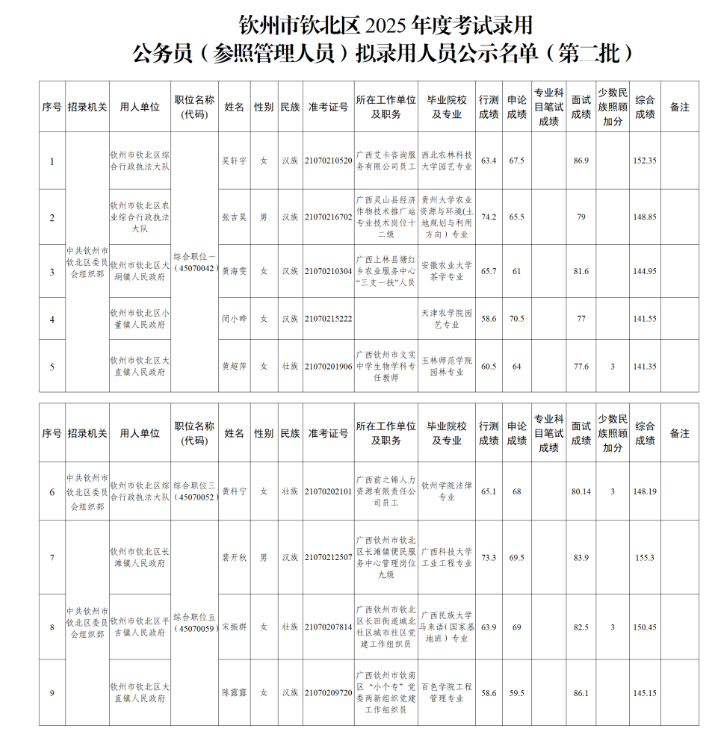附件:欽州市欽北區(qū)2025年度考試錄用公務員(參照管理人員)擬錄用人員公示名單(第二批)