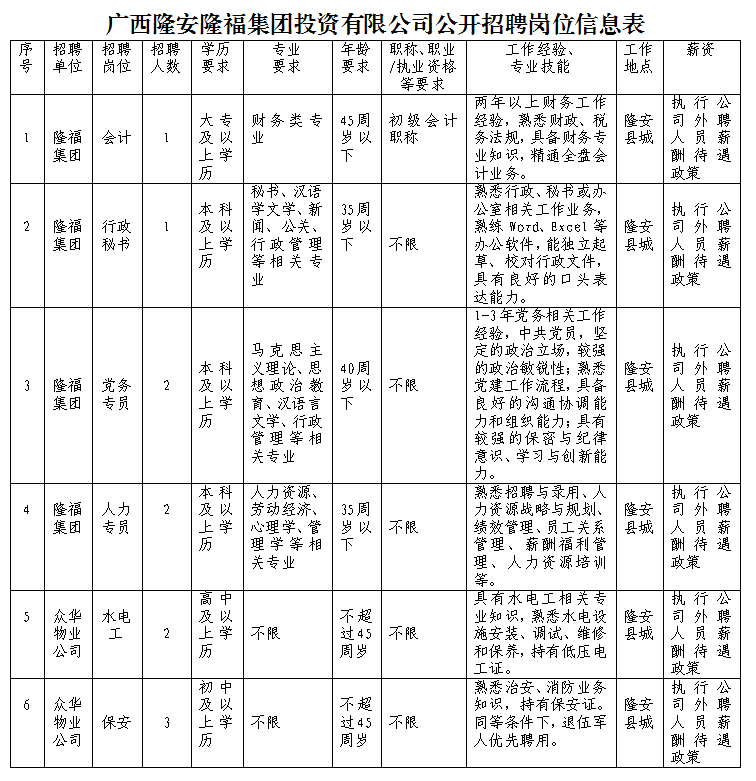 廣西隆安隆福投資集團有限公司(以下簡稱“隆福集團”)是隆安縣人民政府國有獨資企業(yè),注冊資本5億元人民幣。負(fù)責(zé)縣本級基礎(chǔ)設(shè)施建設(shè)、產(chǎn)業(yè)發(fā)展和公共服務(wù)等投融資、建設(shè)、運營管理及國有自然資源開發(fā)、建設(shè)、運營等工作。因工作需要,現(xiàn)面向社會公開招聘數(shù)名外聘工作人員。