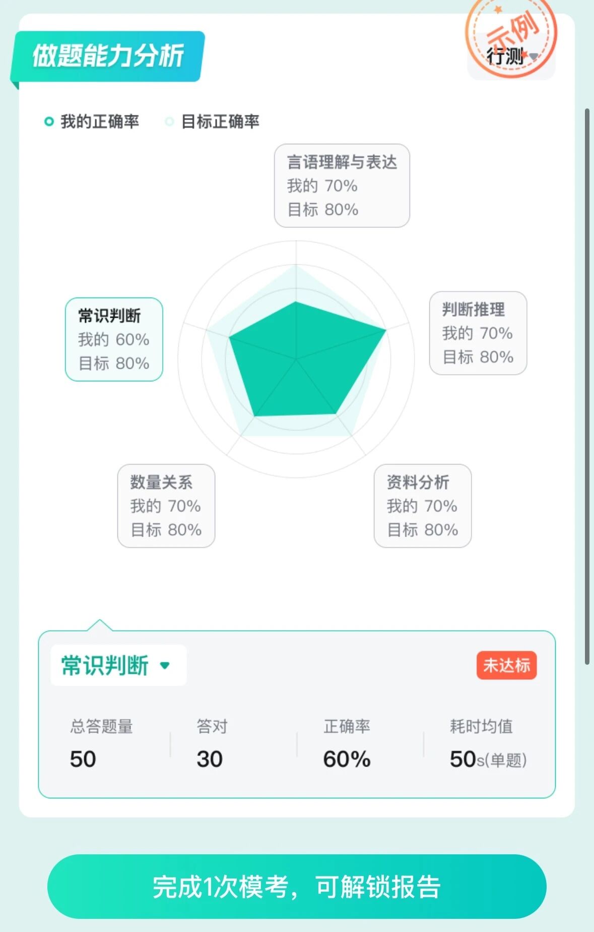 3??生成個(gè)人??紙?bào)告:考完就能查看模考成績、排名及解析,生成的個(gè)人??紙?bào)告包含各模塊正確率分布、做題能力分析、筆試分?jǐn)?shù)yu測等內(nèi)容。