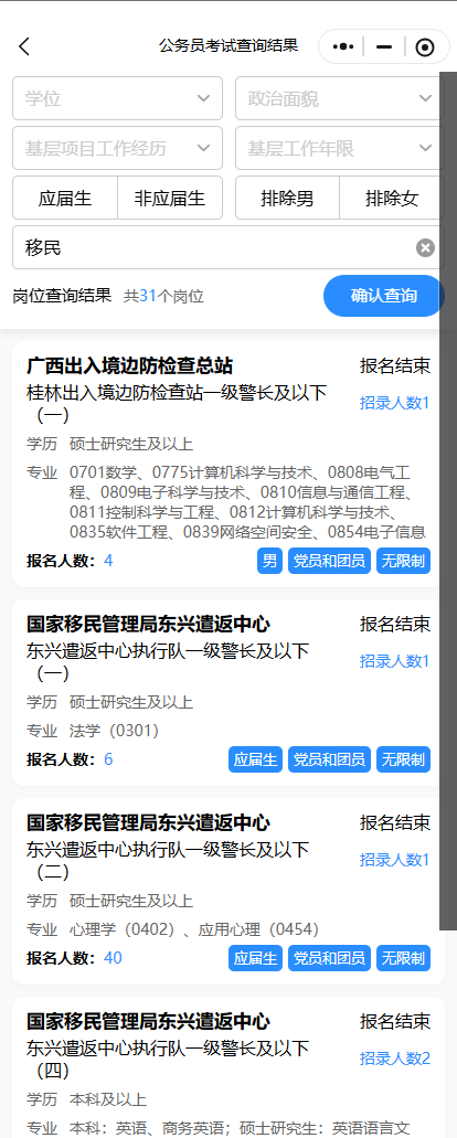 如駐廣西移民管理機(jī)構(gòu)崗位,在公考天眼輸入【移民】可查出2025年國(guó)考廣西崗位中,有31個(gè)崗位信息↓