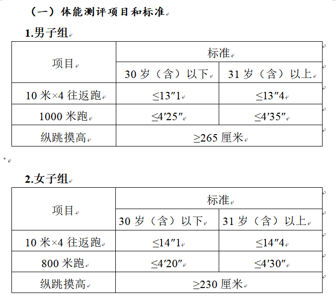 參照《關(guān)于印發(fā)<公安機(jī)關(guān)錄用人民警察體能測(cè)評(píng)項(xiàng)目和標(biāo)準(zhǔn)>的通知》(公政治〔2024〕60號(hào))執(zhí)行,每個(gè)測(cè)評(píng)項(xiàng)目分別記錄成績(jī)。其中縱跳摸高的測(cè)評(píng)次數(shù)不超過(guò)3次,10米×4往返跑測(cè)評(píng)次數(shù)不超過(guò)2次,男子1000米跑、女子800米跑測(cè)評(píng)次數(shù)均為1次。