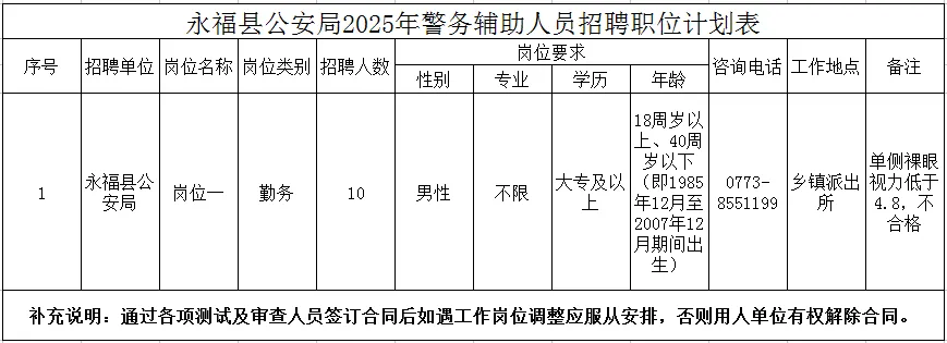 計劃招聘警務輔助人員10名。具體崗位、招聘人數(shù)、資格條件詳見《永??h公安局輔警招聘計劃表》。
