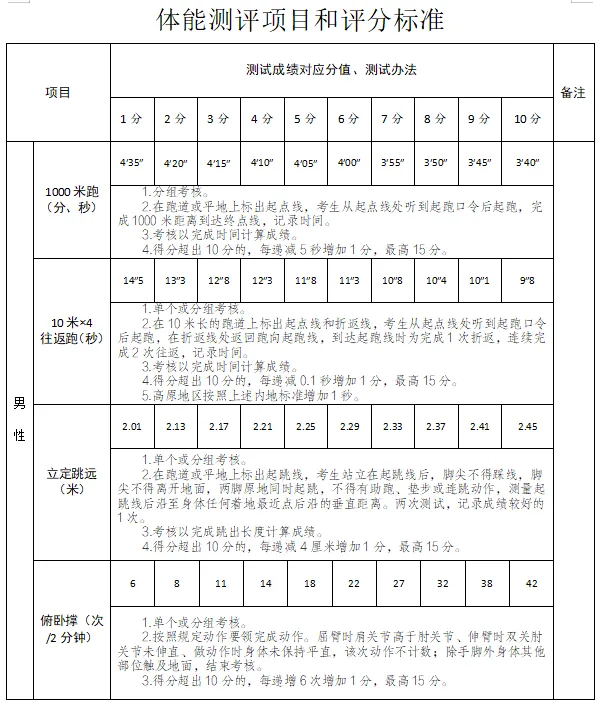 任一單項得分為0的視為“不合格”,予以淘汰。體能測評所有項目均只測試一次。(標準見附件)