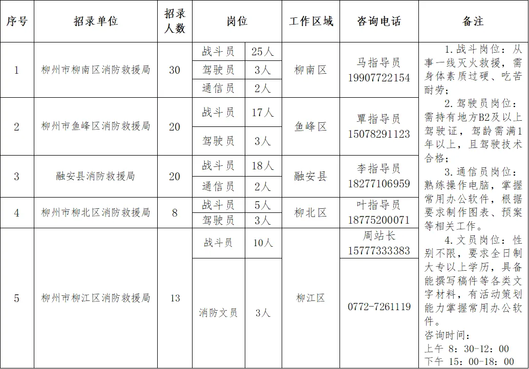 政府專職消防員91人。崗位要求:男性,身高165CM以上,雙眼裸視力4.8以上,需具備高中(中專)以上學歷,年齡為18-28周歲以下(有部隊服役經(jīng)歷或者全日制大專及以上學歷可放寬至30周歲),身體素質過硬、吃苦耐勞、心理健康,無遺傳性、傳染性和慢性疾病,符合體檢標準。