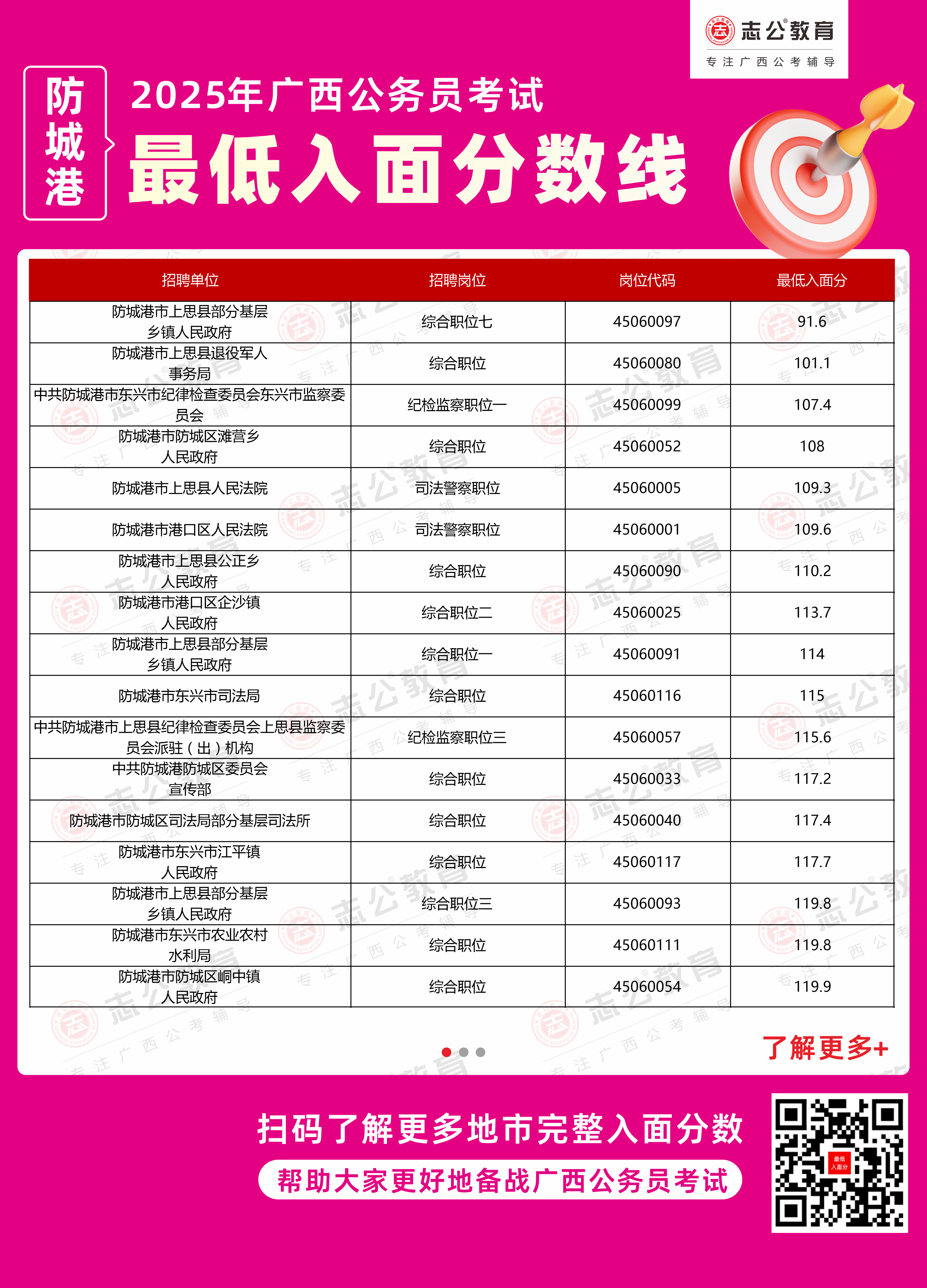 以下為志公教育根據(jù)官方發(fā)布的面試資格審查公告及公開數(shù)據(jù)整理的防城港市部分單位的進(jìn)面最低筆試分?jǐn)?shù)(含照顧加分),數(shù)據(jù)僅供參考,具體以官方實(shí)際公布為準(zhǔn)。