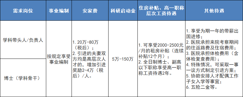 待遇參照國(guó)家事業(yè)單位標(biāo)準(zhǔn)或按照醫(yī)院相關(guān)規(guī)定執(zhí)行,根據(jù)不同人員類(lèi)別給予5萬(wàn)元至10萬(wàn)元(稅后)安家補(bǔ)助獎(jiǎng)勵(lì),具體內(nèi)容請(qǐng)仔細(xì)閱讀招聘公告。