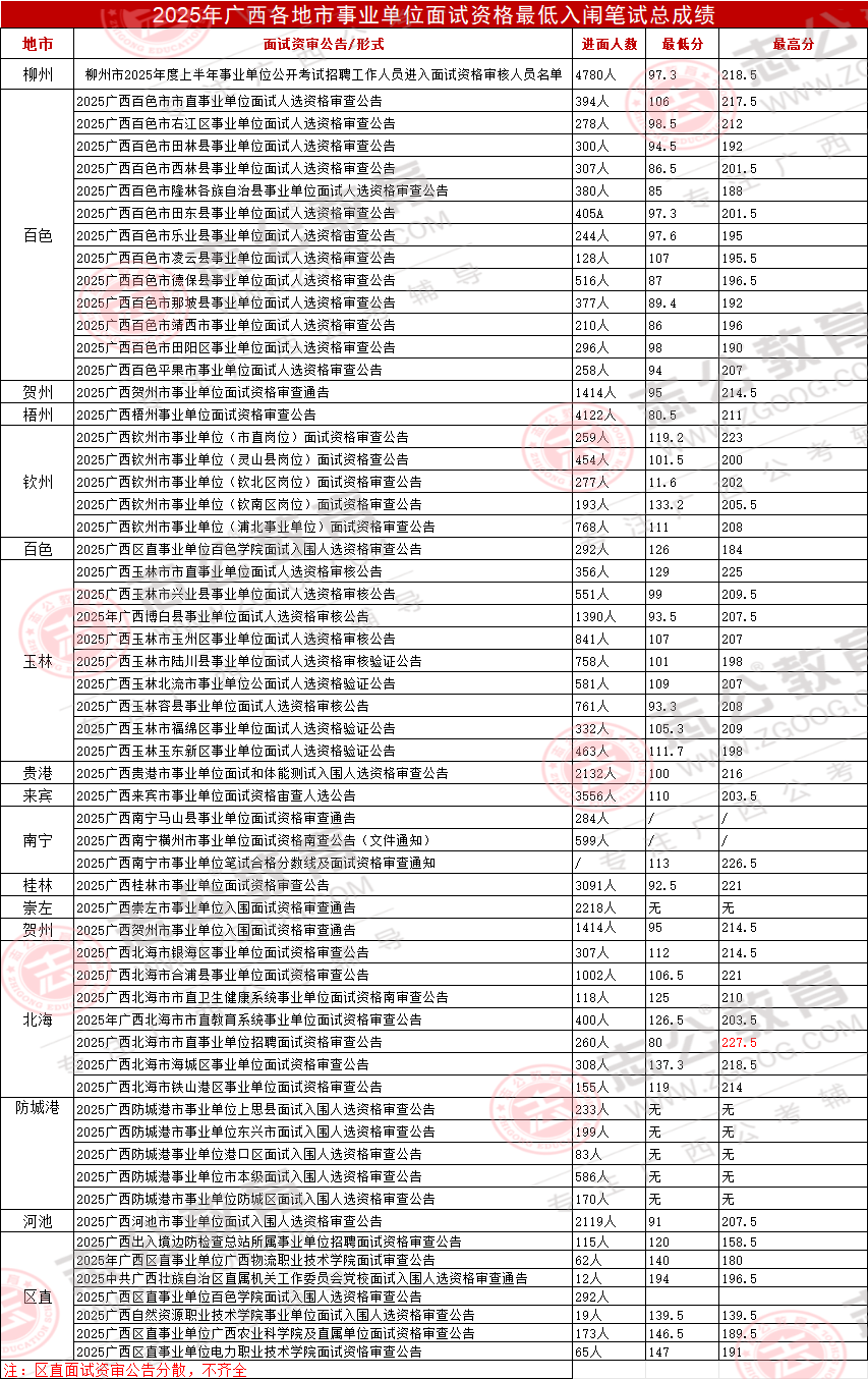 為了讓大家更直面廣西25年上半年事編聯(lián)考的進(jìn)面分情況,廣西志公教育還根據(jù)官方給出的進(jìn)入面試范圍人選zui低筆試總成績(jī),給大家整理了除了部分區(qū)直單位之外的區(qū)直單位、14地市事業(yè)單位zui低、zui高入面分。