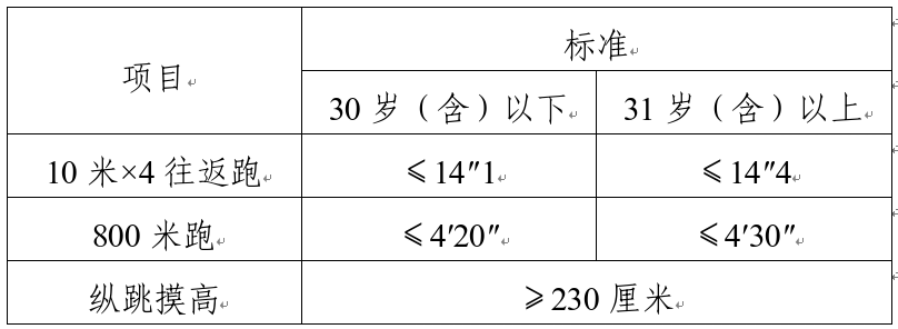 綜合管理類、執(zhí)法勤務(wù)類職位測查全部三個項目,三項全部達(dá)標(biāo)方為合格;警務(wù)技術(shù)類職位免予測查1000米(男)/800米(女)跑項目,其他兩項全部達(dá)標(biāo)方為合格;報考外語及少數(shù)民族語言翻譯緊缺職位的人員,體能測評三項中有兩項達(dá)標(biāo)的,視為合格。