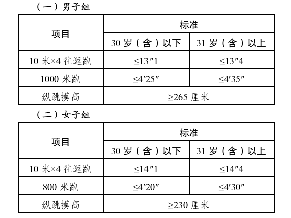 體能測評執(zhí)行中央組織部辦公廳、公安部辦公廳印發(fā)的《公安機(jī)關(guān)錄用人民警察體能測評項(xiàng)目和標(biāo)準(zhǔn)》(公政治〔2024〕60號)有關(guān)規(guī)定,縱跳摸高每人最多可測3次,10米×4往返跑每人最多可測2次,男子1000米(女子800米)每人最多可測1次。體能測評的項(xiàng)目和標(biāo)準(zhǔn)如下: